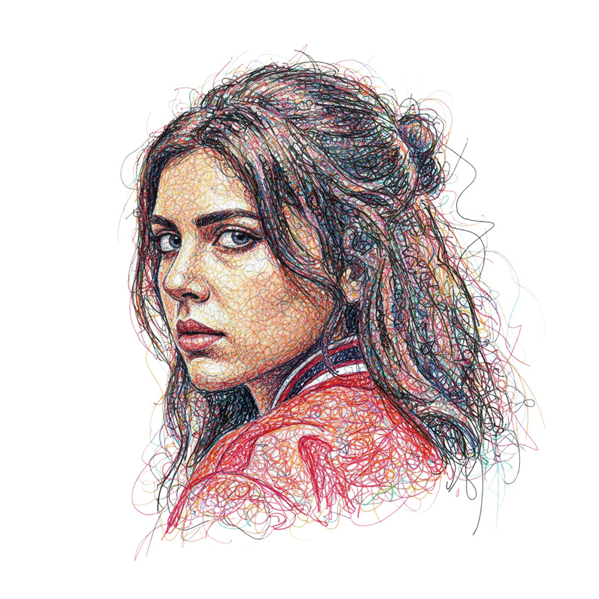 Black ink scribbles on textured paper with an artistic, hand-drawn feel. Creates expressive portraits using chaotic, looping lines that dissolve into dynamic, trailing strokes.